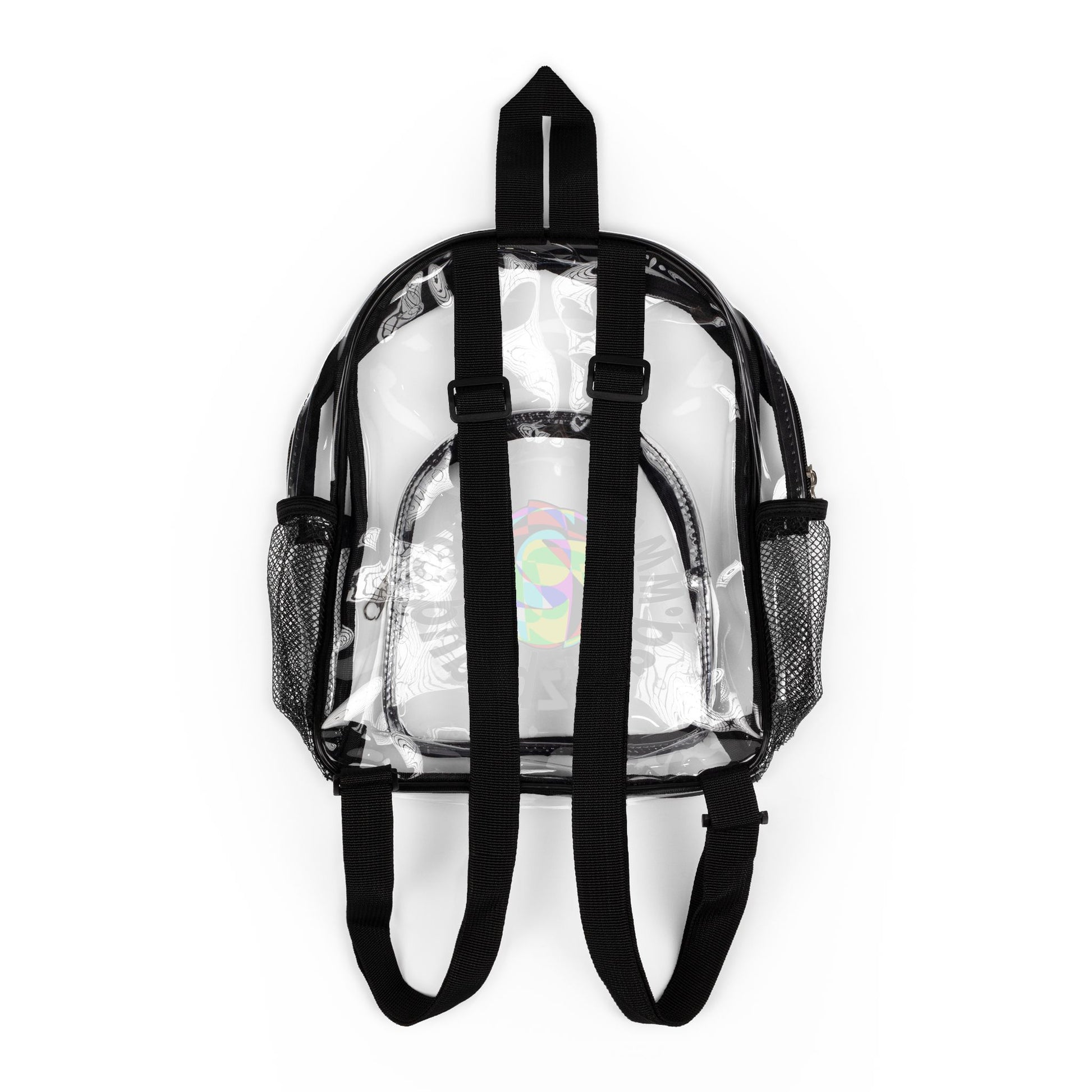 Transparent stadium backpack built for hands-free, no-fuss days. The clear PVC shell shows off graphics printed on the inside while keeping contents visible and protected from spills and rain. A roomy main compartment plus front pocket and side mesh holders carry water bottles, snacks, and game-day essentials without bulk. Adjustable shoulder straps and a top carry loop let you switch between sling-style wear and traditional backpack comfort. Clean, modern lines with internal front-and-back prints make this a practical, style-forward carry option for venues with clear-bag policies.