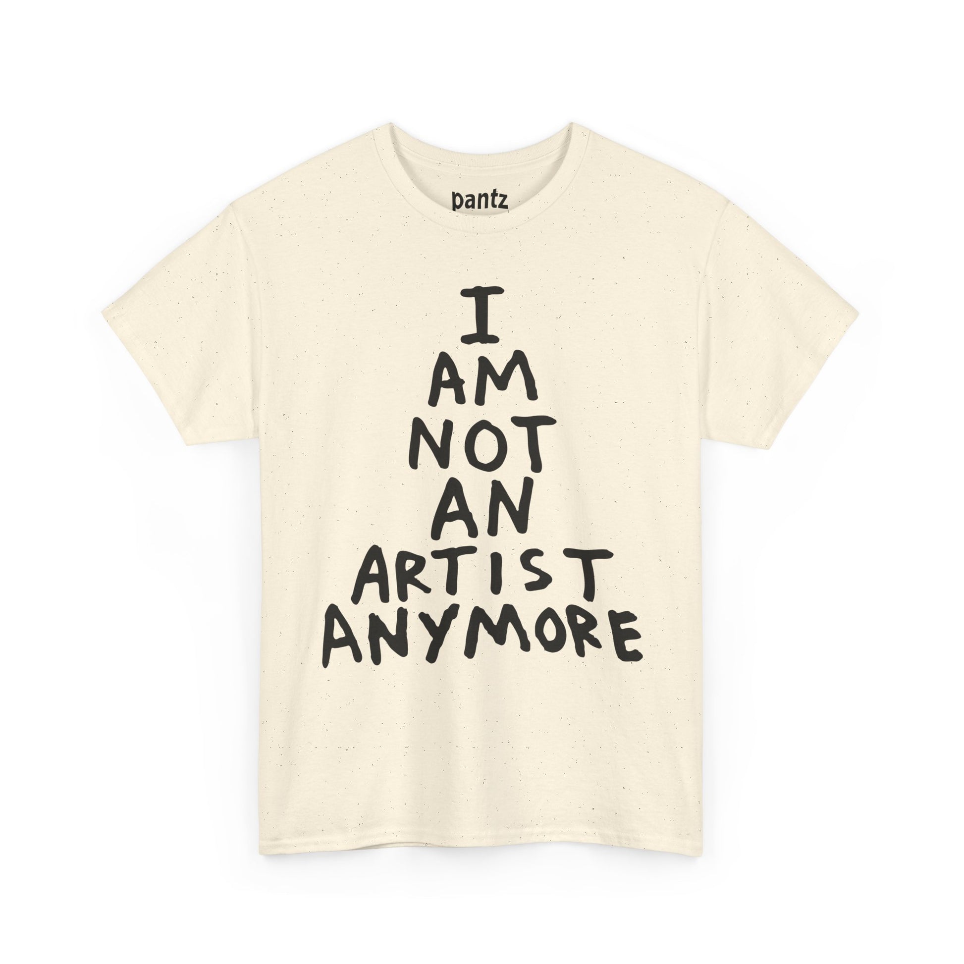 This breathable, mid-weight tee carries a quiet, sardonic voice — handwritten lettering stacked into a triangular shape reads: "I AM NOT AN ARTIST ANYMORE." The white cotton surface gives the text room to stand out, while a small, photo-style patch sits on the sleeve for an extra, offbeat detail. Wear it layered under a denim jacket or alone with relaxed jeans; it feels like a private statement worn in public. The fit is roomy without being baggy, and the soft, smooth knit keeps the printed message clear and crisp. Built to last and made with ethically sourced cotton, this shirt feels lived-in from the first wear and keeps its shape through repeat washings.